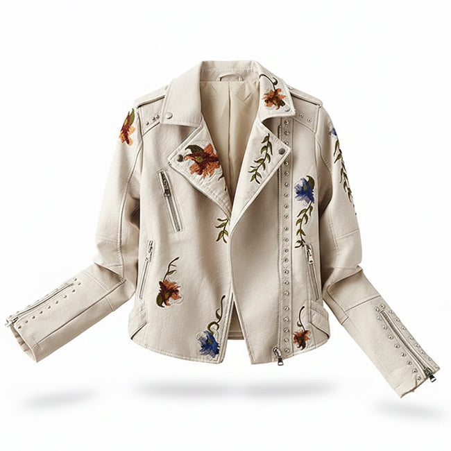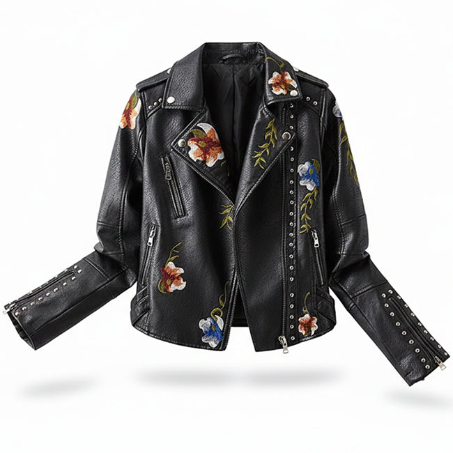 Design: Fitted biker jacket with floral embroidery and studs